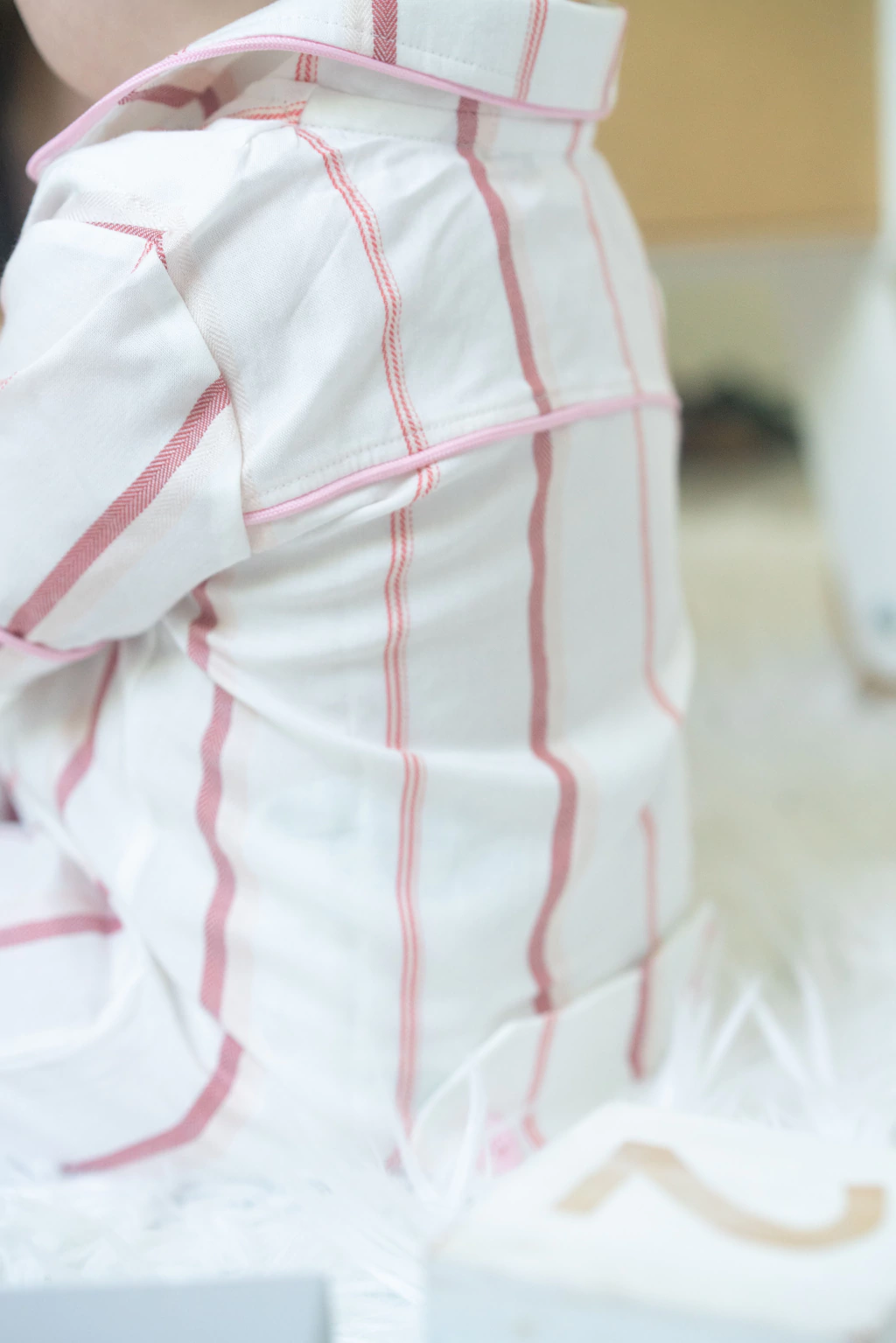 Enterito camisero de manga corta que presenta un elegante cuello y una fila de botones en la parte frontal. Estas prenda es el atuendo perfecto para permitar a los niños jugar, divertirse e irse a dormir cómodos y frescos.
