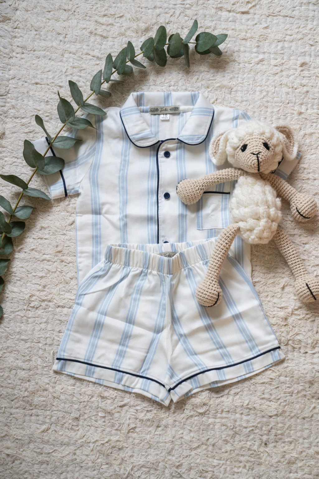 La camisa de manga corta presenta un elegante cuello y una fila de botones en la parte frontal, mientras que el short está diseñado con una cintura elástica para garantizar comodidad. Estas dos prendas combinadas crean el atuendo perfecto para permitar a los niños jugar, divertirse e irse a dormir cómodos y frescos.